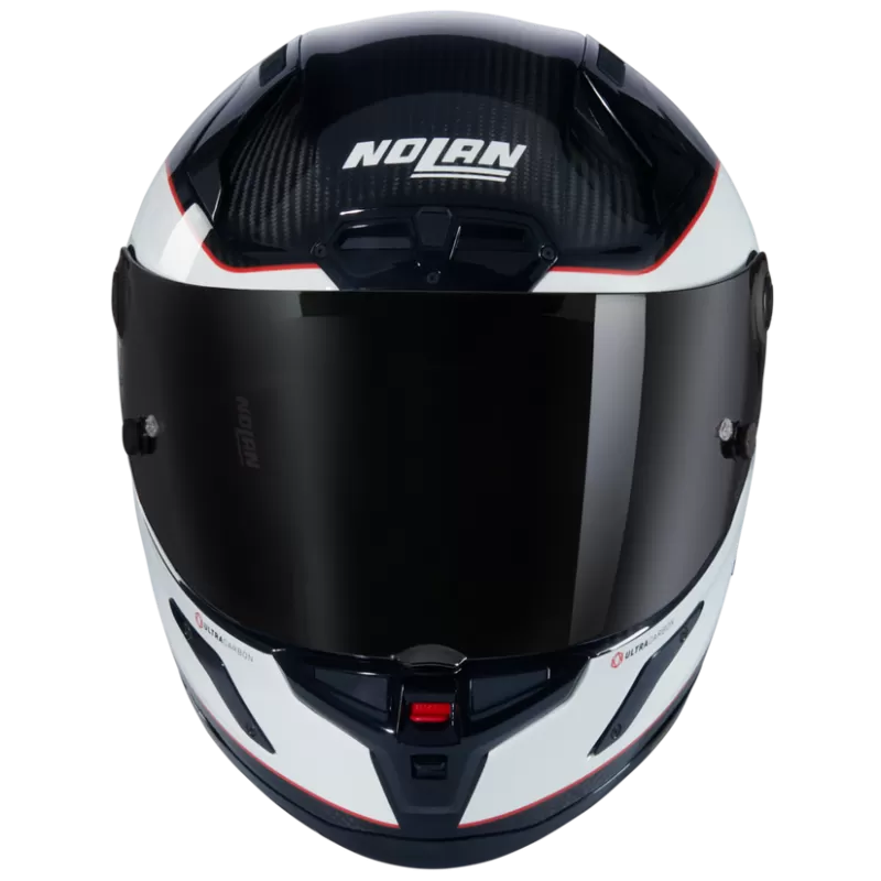 La texture in carbonio della calotta si alterna a vista con il colore Nero e il Bianco della vernice lucida. Un raffinato outline evidenzia e allunga la forma della visiera ultra-wide, creando un dinamismo ancora più marcato, di colore Rosso o nella variante Carbonio / Nero / Italia, espresso da una finissima bandiera italiana.