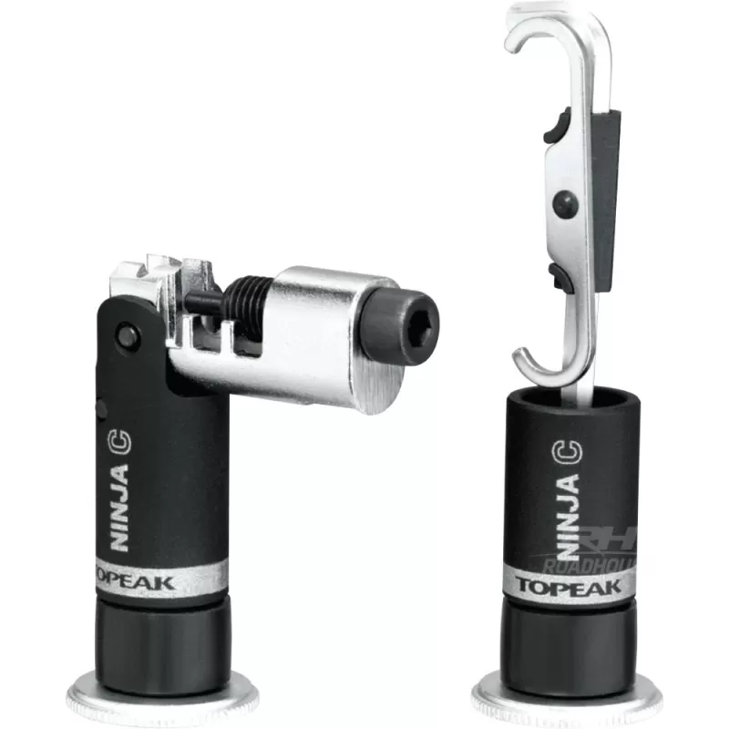 Il multiattrezzo Topeak Ninja C è pensato per essere riposto nelle manopole della mountain bike o nel manubrio della bici da corsa. È un utensile discreto con uno smagliacatene, una chiave Allen da 4 mm e un gancio per la catena.