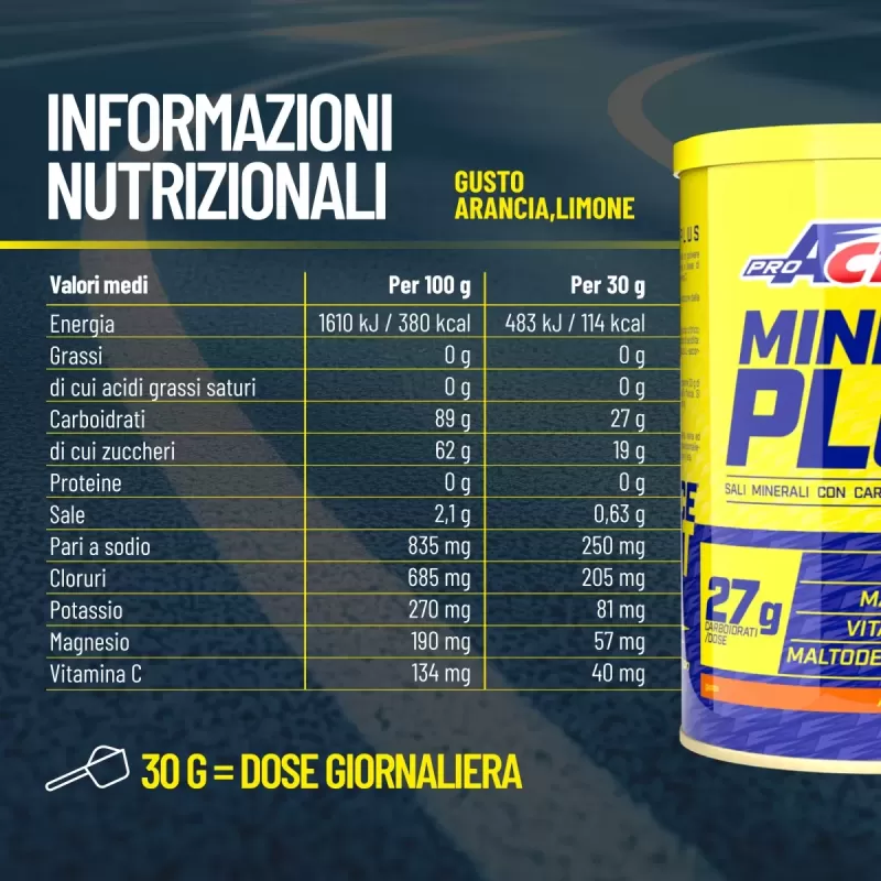 Además de magnesio, sodio y potasio, Proaction Mineral Plus contiene maltodextrinas, una fuente de carbohidratos que desarrollan menos la presión osmótica que los carbohidratos de peso molecular simple, igual a 1/5 en comparación con glucosio; Todo esto garantiza un rápido vaciado gástrico y, por lo tanto, una mayor velocidad de absorción de plasma.